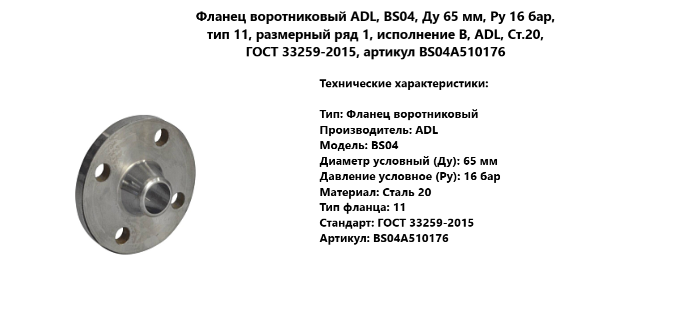 Фланец воротниковый ADL, BS04, Ду 65 мм, Py 16 бар, тип 11, размерный ряд 1, исполнение В, ADL, Ст.20, ГОСТ 33259-2015, BS04A510176