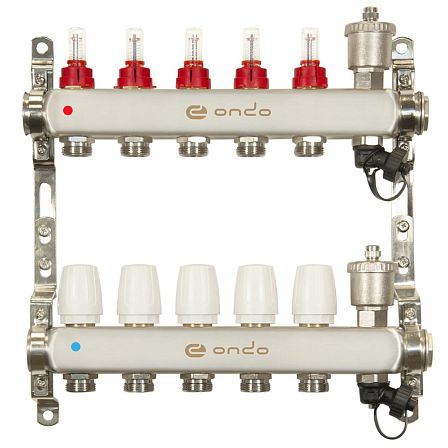 Коллекторная группа ONDO нерж сталь 5 вых. в сборе с автоматическим воздухоотводчиком, расходомерами и термостатическими клапанами