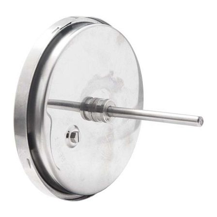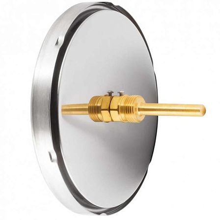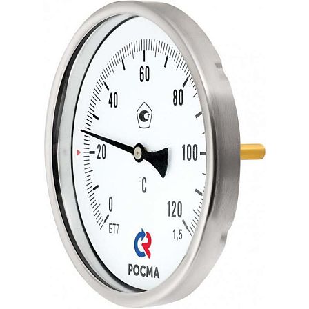 Термометр биметаллический (осевое присоединение) РОСМА тип БТ, серия 211 (артикул 00000002403) в комплекте с защитной латунной* погружной гильзой. Прибор предназначен для измерения температуры жидкостей, пара и газов в отопительных и санитарных установках, в системах кондиционирования и вентиляции. Принцип действия прибора основан на зависимости деформации чувствительного элемента от измеряемой температуры. В качестве чувствительного элемента используется биметаллическая пружина. Она изготавливается из двух прочно соединенных металлических пластин, имеющих различные температурные коэффициенты линейного расширения. При изменении температуры пружина изгибается и вращает стрелку термометра. Один её конец закреплен внутри штока, а к другому присоединяется ось стрелки. Корпус прибора изготавливается из коррозионностойкой стали, шток — из нержавеющей стали.