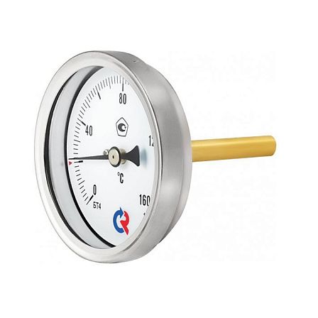 Термометр биметаллический (осевое присоединение) РОСМА серия БТ, тип 211 (артикул 00000005651) в комплекте с защитной латунной* погружной гильзой. Прибор предназначен для измерения температуры жидкостей, пара и газов в отопительных и санитарных установках, в системах кондиционирования и вентиляции. Принцип действия прибора основан на зависимости деформации чувствительного элемента от измеряемой температуры. В качестве чувствительного элемента используется биметаллическая пружина. Она изготавливается из двух прочно соединенных металлических пластин, имеющих различные температурные коэффициенты линейного расширения. При изменении температуры пружина изгибается и вращает стрелку термометра. Один её конец закреплен внутри штока, а к другому присоединяется ось стрелки. Корпус прибора изготавливается из коррозионностойкой стали, шток — из нержавеющей стали.