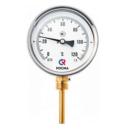 Термометр биметаллический РСОМА тип БТ, серия 211 (артикул 00000032534) предназначен для измерения температуры жидкостей, пара и газов в отопительных и санитарных установках, в системах кондиционирования и вентиляции. Радиальное присоединение в комплекте с защитной латунной* гильзой.