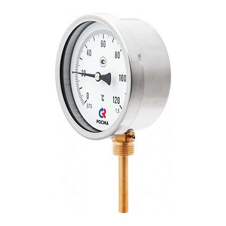 Термометр биметаллический РОСМА тип БТ, серия 211 (артикул 00000032079) предназначен для измерения температуры жидкостей, пара и газов в отопительных и санитарных установках, в системах кондиционирования и вентиляции. Радиальное присоединение в комплекте с защитной латунной* гильзой.