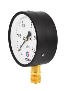 Манометр стандартный РОСМА Тип ТМ (МТИ), серия 10 (артикул 00000030014) используется для измерения избыточного, вакуумметрического или мановакуумметрического давления неагрессивных к медным сплавам жидких и газообразных, не вязких и не кристаллизующихся сред. При этом рабочая температура измеряемой среды - до 150 °C. Корпус манометров в стандартном исполнении выполнен из стали, механизм — из латунного сплава. Принцип действия манометров приборов основан на зависимости деформации чувствительного элемента от измеряемого давления. В качестве чувствительного элемента используется трубка Бурдона. Под воздействием измеряемого давления свободный конец трубки перемещается с помощью специального механизма и вращает стрелку манометра.