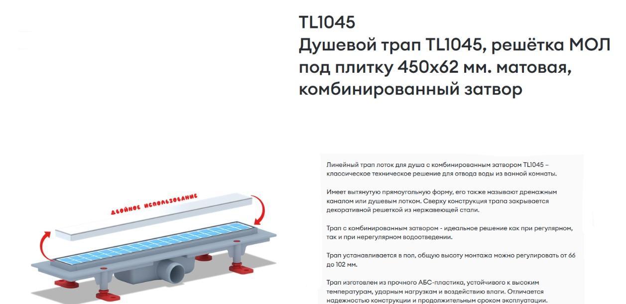 Сверху трап закрывает прямоугольная гладкая глянцевая решетка (нержавеющая сталь), которая задерживает мусор, препятствуя забиванию слива, а также выполняет декоративную функцию. На решетку можно становиться, принимая душ: изделие выдерживает нагрузку до 300 кг.
