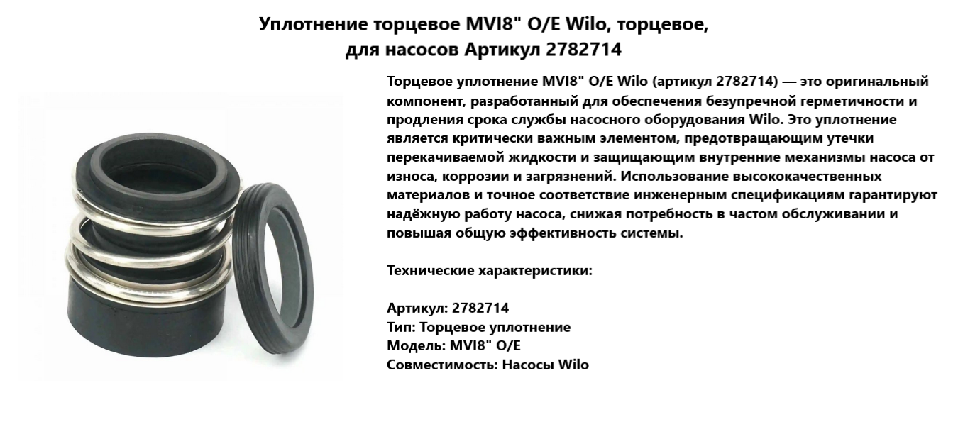 Торцевое уплотнение MVI8" О/Е Wilo (артикул 2782714) — это оригинальный компонент, разработанный для обеспечения безупречной герметичности и продления срока службы насосного оборудования Wilo. Это уплотнение является критически важным элементом, предотвращающим утечки перекачиваемой жидкости и защищающим внутренние механизмы насоса от износа, коррозии и загрязнений. Использование высококачественных материалов и точное соответствие инженерным спецификациям гарантируют надёжную работу насоса, снижая потребность в частом обслуживании и повышая общую эффективность системы.