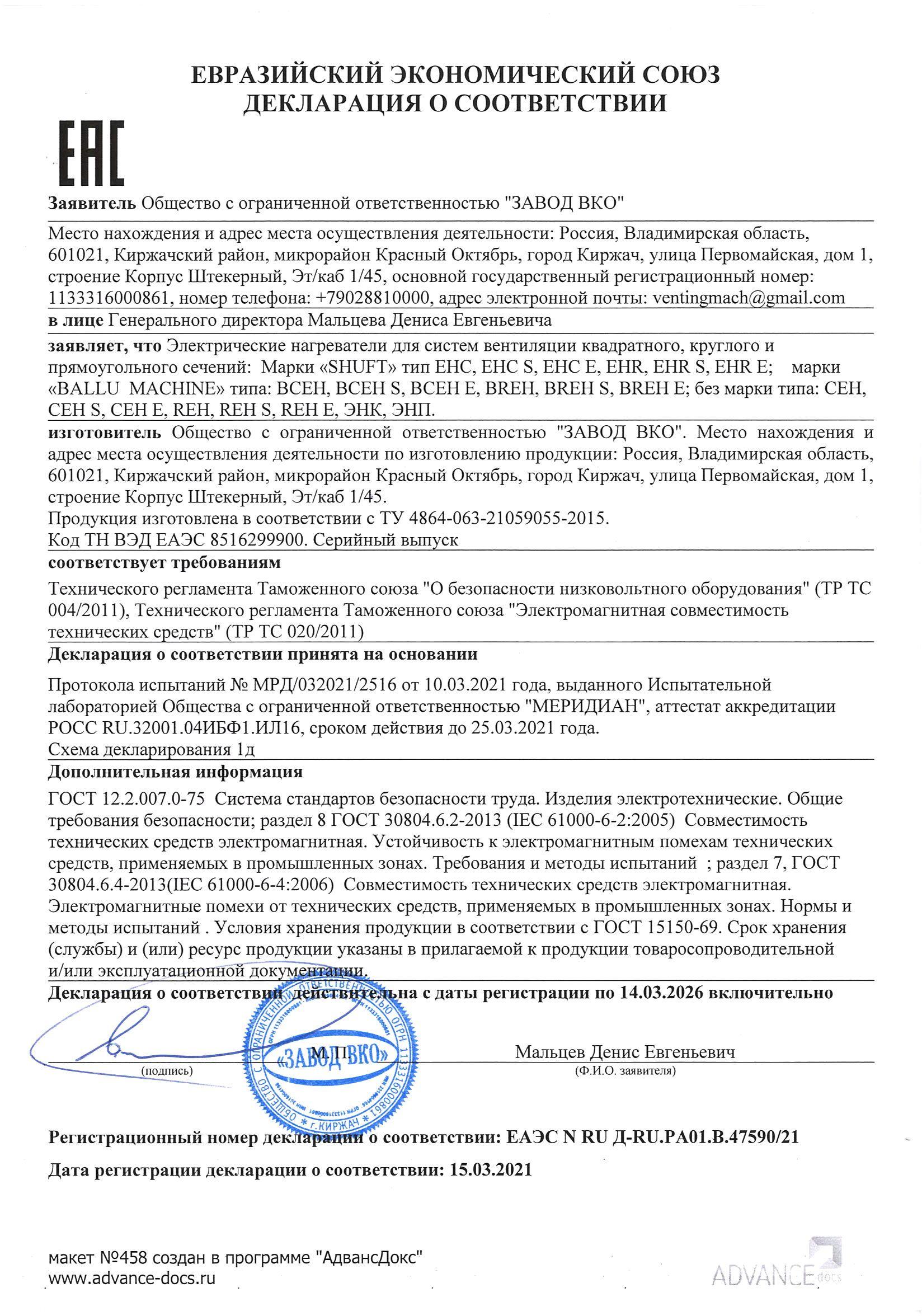 Электрический нагреватель для прямоугольных каналов EHR 900*500-45