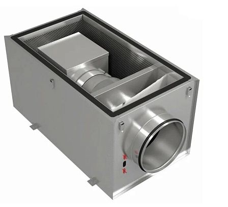 Приточная установка оснащена фильтром класса EU5, электрическим нагревателем с ТЭНами из нержавеющей стали и вентилятором. Вентилятор оборудован асинхронным двигателем с внешним ротором и не требующими обслуживания уплотненными подшипниками с увеличенным сроком службы. Защита двигателя вентилятора осуществляется встроенными термоконтактами. Трехфазные электрические нагреватели оснащены двухступенчатой защитой от перегрева. Первая ступень настроена на 50°С и перезапускается автоматически, вторая ступень настроена на 100°С и перезапускается вручную.