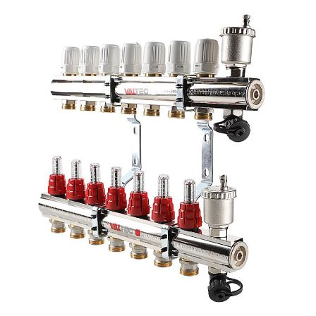 Коллекторный блок с регул. клап. и расх., 1"х7 вых. Евроконус 3/4", артикул VTc.596.EMNX.0607 оснащено индивидуальными регулирующими клапанами и измерителем расхода, что обеспечивает точное дозирование жидкости и плавную балансировку гидравлической системы.