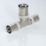 Пресс-фитинг – тройник предназначен для соединения трех труб – металлопластиковых либо из сшитого полиэтилена. Корпус выполнен из сантехнической латуни марки CW617N, уплотнительные кольца штуцеров – из EPDM плотностью 1,22 г/см3, пресс-гильзы – из нержавеющей стали. Нейлоновая обойма выполняет функции фиксатора гильзы, направляющей для пресс-насадок и диэлектрической прокладки, прерывающей контакт между алюминием трубы и латунью корпуса.