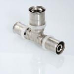 Пресс-фитинг – тройник предназначен для соединения трех труб – металлопластиковых либо из сшитого полиэтилена. Корпус выполнен из сантехнической латуни марки CW617N, уплотнительные кольца штуцеров – из EPDM плотностью 1,22 г/см3, пресс-гильзы – из нержавеющей стали. Нейлоновая обойма выполняет функции фиксатора гильзы, направляющей для пресс-насадок и диэлектрической прокладки, прерывающей контакт между алюминием трубы и латунью корпуса.