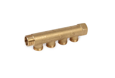 Распределительный коллектор представляет собой функциональный элемент трубопроводной арматуры, предназначенный для разделения потока рабочей среды на четыре равных направления. Изделие поставляется в исполнении из натуральной латуни без гальванического напыления (никелирования).
