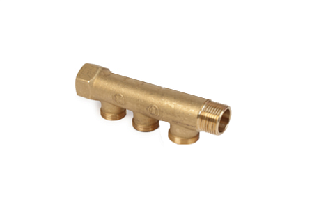 Корпус распределителя изготовлен из латуни, что обеспечивает однородность структуры металла и высокую стойкость к гидравлическим нагрузкам. В конструкции отсутствуют защитные покрытия (никель/хром), корпус имеет естественный цвет латунного сплава. Формат резьбы 1" (ВР-НР) позволяет соединять несколько коллекторов в единые группы без использования дополнительных муфт. Полнопроходная конструкция магистрали минимизирует турбулентность и потерю давления.