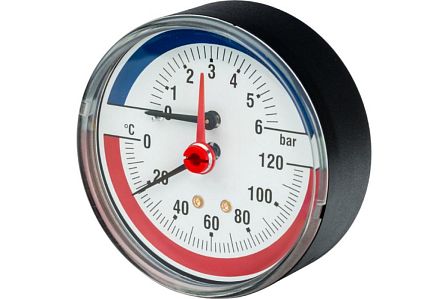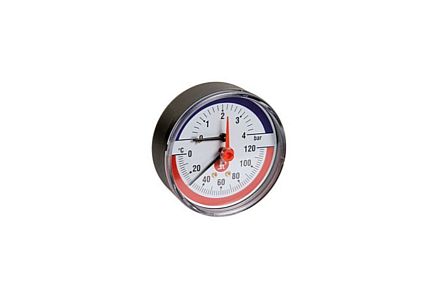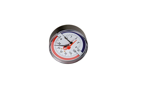 Термоманометр 1/2" 4 бар представляет собой комбинированное контрольно-измерительное устройство, предназначенное для одновременного мониторинга статического давления и температуры рабочей среды в гидравлических контурах. Прибор применяется в системах отопления, водоснабжения и тепловых пунктах для визуального контроля параметров теплоносителя в режиме реального времени.