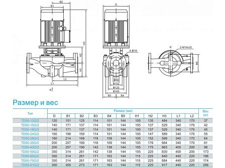 Насос циркуляционный CNP серии TD50-18G/2 одноступенчатый, центробежный, рядный, с соосным размещением патрубков («ин-лайн»), оборудованный стандартным двигателем и рабочим колесом из чугуна.