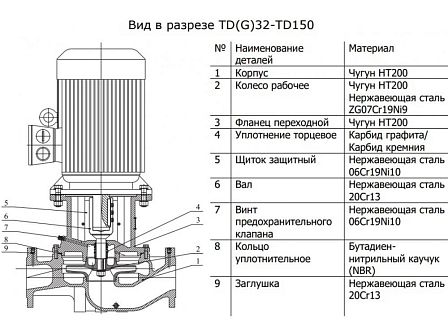 - Насосы серии TD являются моноблочными и состоят из стандартного асинхронного электродвигателя и насосной части, соединённых переходным фланцем.