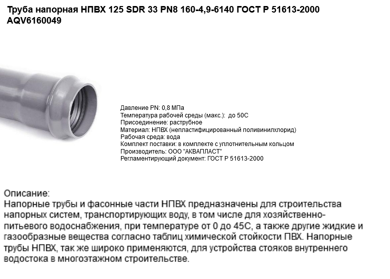ТРУБА НПВХ НАПОРНАЯ AQUAVIVA 160х4.9х6140 мм SDR 26 PN10 раструбная под уплотнительное кольцо AQV6160049