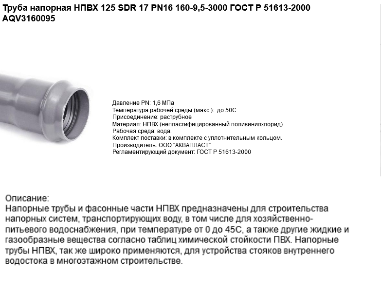 ТРУБА НПВХ НАПОРНАЯ AQUAVIVA 160х9,5х3000 мм SDR 17 PN16 раструбная под уплотнительное кольцо AQV3160095