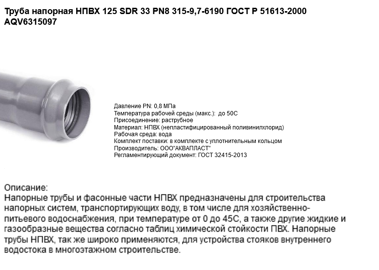 ТРУБА НПВХ НАПОРНАЯ AQUAVIVA 315х9.7х6190 мм SDR 33 PN8 раструбная под уплотнительное кольцо AQV6315097