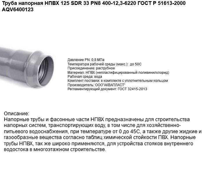 ТРУБА НПВХ НАПОРНАЯ AQUAVIVA 400х12.3х6220 мм SDR 33 PN8 раструбная под уплотнительное кольцо AQV6400123