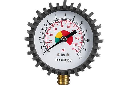 Манометр с резиновым покрытием (63 мм; 1/4) INTERTOOL PT-0502 подходит к любым пистолетам для накачки шин, а также к другим устройствам. Возможно использование для отображения давления на любых устройствах и механизмах, работающих со сжатым воздухом от 0 до 12 бар. Внешняя резьба 1/4" имеет нижнее расположение. Прост в использовании. Обеспечивает высокоточное измерение давления. Защищен от механических повреждений, благодаря эластичному пластиковому корпусу с резиновым покрытием.