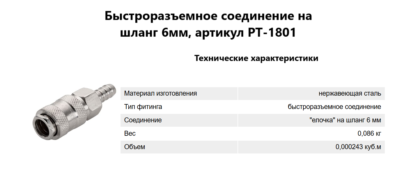 Быстроразъемное соединение на шланг 6мм, артикул PT-1801