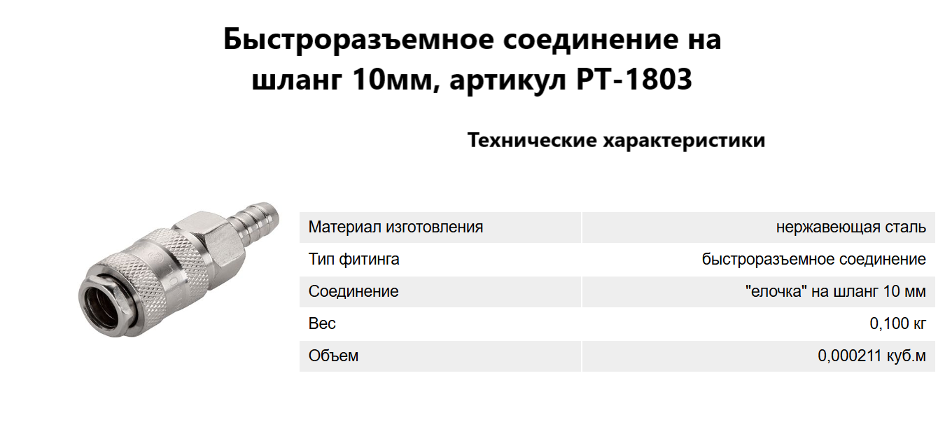 PT-1803 — быстроразъёмное соединение для гибких шлангов диаметром 10 мм идеально подходит для быстрой установки и снятия пневматического инструмента и различного оборудования. Благодаря своей конструкции обеспечивает герметичное подключение и мгновенное отсоединение от магистрали подачи сжатого воздуха без потери давления.Изделие отличается долговечностью и стойкостью к коррозии, выдерживает значительные нагрузки и гарантирует полную герметичность соединений.