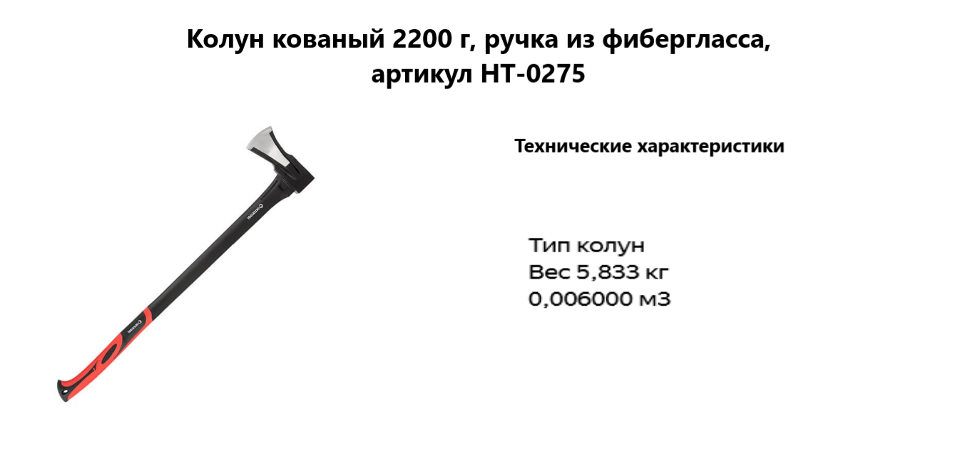 Колун кованый представляет собой тяжелый ударный инструмент, предназначенный для раскалывания массивных древесных заготовок, крупных поленьев и пней. Увеличенная масса кованой головки (2.2 кг) обеспечивает высокую кинетическую энергию при ударе, необходимую для работы с древесиной высокой плотности и большого диаметра.