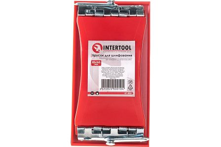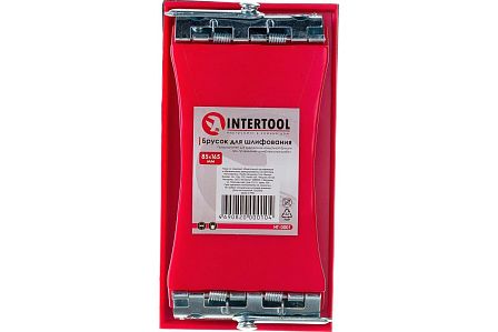 Инструмент (шлифблок) состоит из жесткого основания размером 85 на 165 мм, снабженного рукояткой для распределения осевой нагрузки. Фиксация наждачного полотна или шлифовальной сетки осуществляется посредством двух зажимов, расположенных на торцевых частях корпуса. Механизм обеспечивает натяжение абразива, исключая его смещение в процессе эксплуатации. Габариты 85х165 мм ориентированы на обработку средних и малых площадей, а также работу в местах с ограниченным доступом.