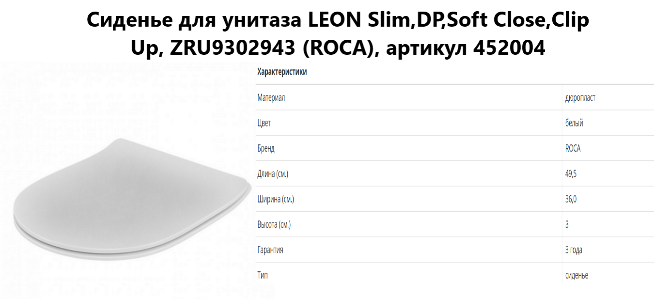 Сиденье с крышкой является штатным комплектующим элементом для унитазов Roca серии Leon. Изделие выполнено в конструктивном варианте Slim, характеризующемся уменьшенной толщиной профиля и облегченной геометрией при соблюдении стандартов механической прочности.