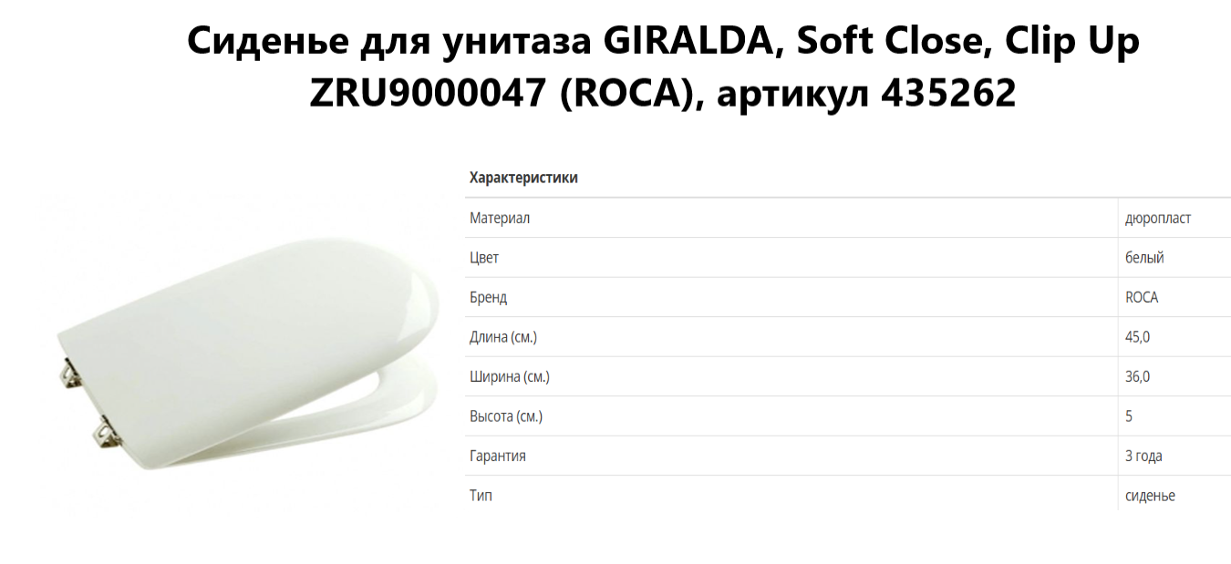 Сиденье с крышкой артикул является комплектующим элементом для унитазов серии Giralda производства компании Roca. Изделие спроектировано с учетом геометрических особенностей чаш данной коллекции и предназначено для обеспечения гигиенической эксплуатации сантехнического прибора.