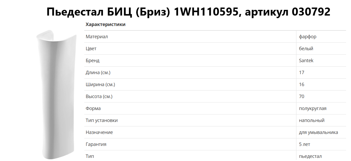 Изделие представляет собой опорную колонну (пьедестал) для раковин серии «Бриз» (БИЦ), изготовленную из сантехнического фарфора методом литья. Данный конструктивный элемент предназначен для обеспечения вертикальной устойчивости умывальника и скрытого размещения водопроводной и канализационной арматуры.