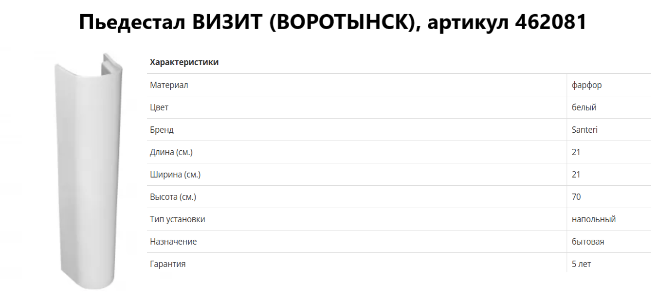 Изделие представляет собой керамическую опорную стойку (постамент) для умывальника серии «Визит», производимую на мощностях завода «Воротынский санфарфор». Данный конструкционный элемент предназначен для фиксации чаши раковины и скрытого размещения инженерных коммуникаций (сифона, гибкой подводки, труб водоотведения).