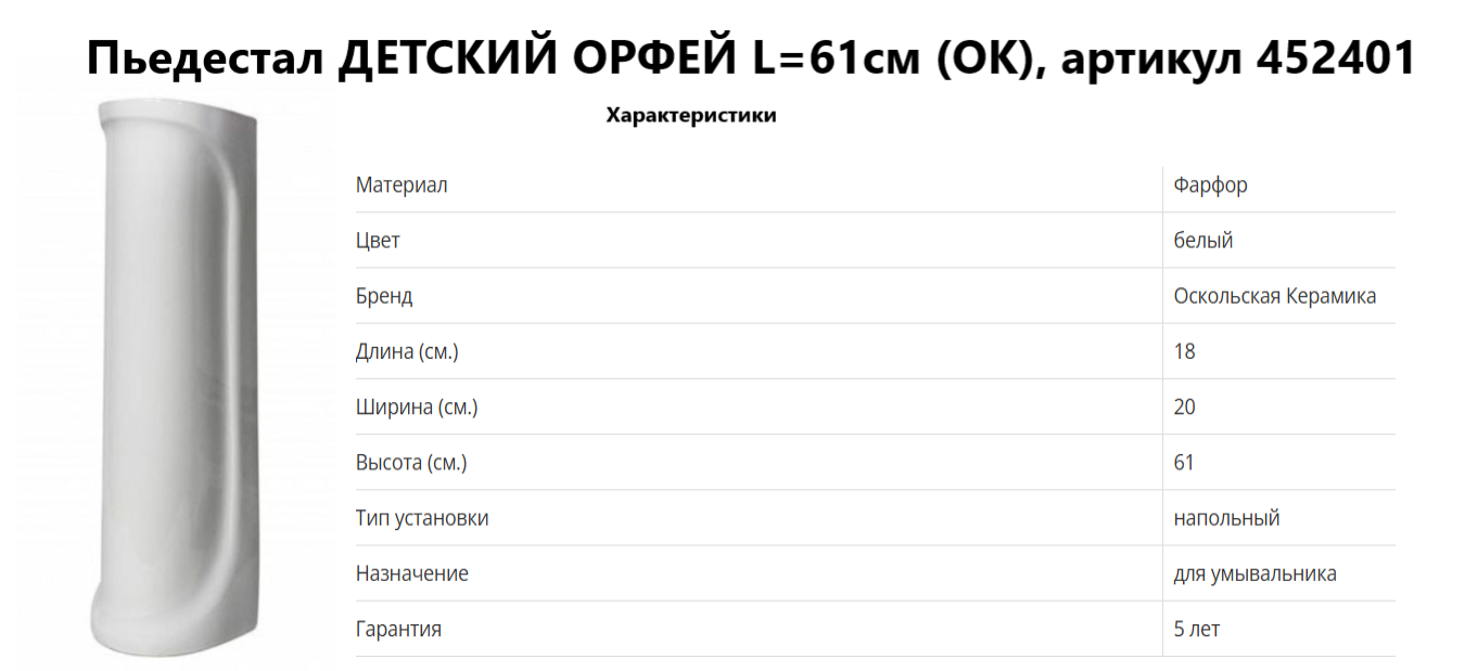 Изделие выполняет роль вертикального несущего модуля. Основная задача пьедестала — перенос веса чаши и динамических нагрузок при эксплуатации на поверхность пола, а также скрытие элементов водоотведения (сифона, отводящих патрубков) и гибкой подводки. Уменьшенная высота (61 см) обеспечивает соблюдение эргономических норм при обустройстве санузлов в детских дошкольных учреждениях (ДДУ) и школах. Конструкция корпуса — пустотелая, с открытой тыльной частью для беспрепятственного подвода инженерных коммуникаций.