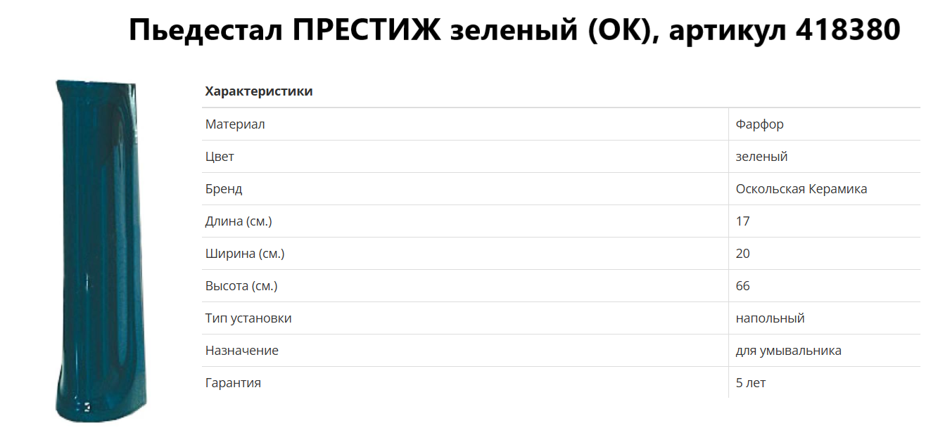 Изделие представляет собой стационарную напольную опору (постамент) для умывальников серии «Престиж». Производство осуществляется заводом «Оскольская керамика» (ОК). Данный конструктивный элемент предназначен для вертикальной поддержки чаши раковины и эстетической изоляции узлов водоотведения и водоподачи.