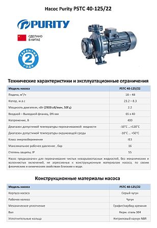 | Модель | Насосный агрегат моноблочный фланцевый PURITY PSTC 40-125/22 |