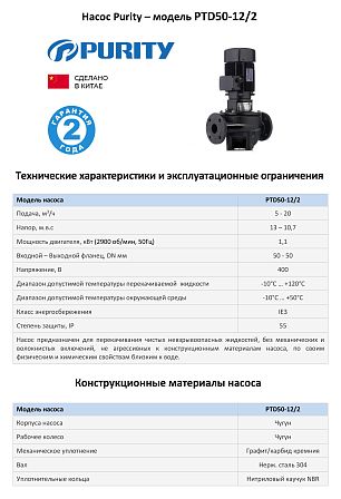 | Модель | Циркуляционный насос In-Line PURITY PTD 50-12/2 |