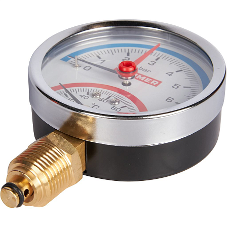 Термоманометр ROMMER RIM RIM-0006-800615 — это многофункциональный прибор для точного контроля параметров отопительных систем. Он одновременно измеряет температуру до 120 °C и давление, обеспечивая полный контроль над работой оборудования. Оснащение автоматическим запорным клапаном значительно упрощает обслуживание и демонтаж без необходимости слива теплоносителя из системы. Радиальный тип подключения 1/2 дюйма и диаметр корпуса 80 мм делают его удобным для установки в различных конфигурациях.