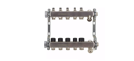Стальной коллектор USYSTEMS UN оснащен пятью выходами (контурами). Каждый вторичный отвод имеет наружную резьбу 3/4" стандарта «евроконус», что позволяет подключать трубы из сшитого полиэтилена, через соответствующие компрессионные фитинги. Основное подключение магистрального трубопровода осуществляется через накидную гайку диаметром 1" (один дюйм), обеспечивающую герметичное соединение без необходимости дополнительного уплотнения резьбы при использовании плоских прокладок.