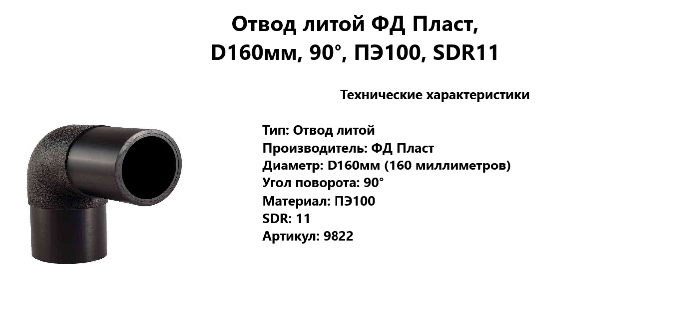 Отвод литой ФД Пласт, D160мм, 90°, ПЭ100, SDR11, 9822