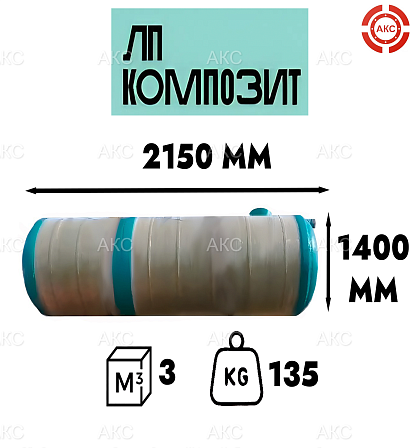 Емкость накопительная стеклопластик 3 м3, 1400*2150 мм, в комплекте с горловиной, ЛП- КОМПОЗИТ