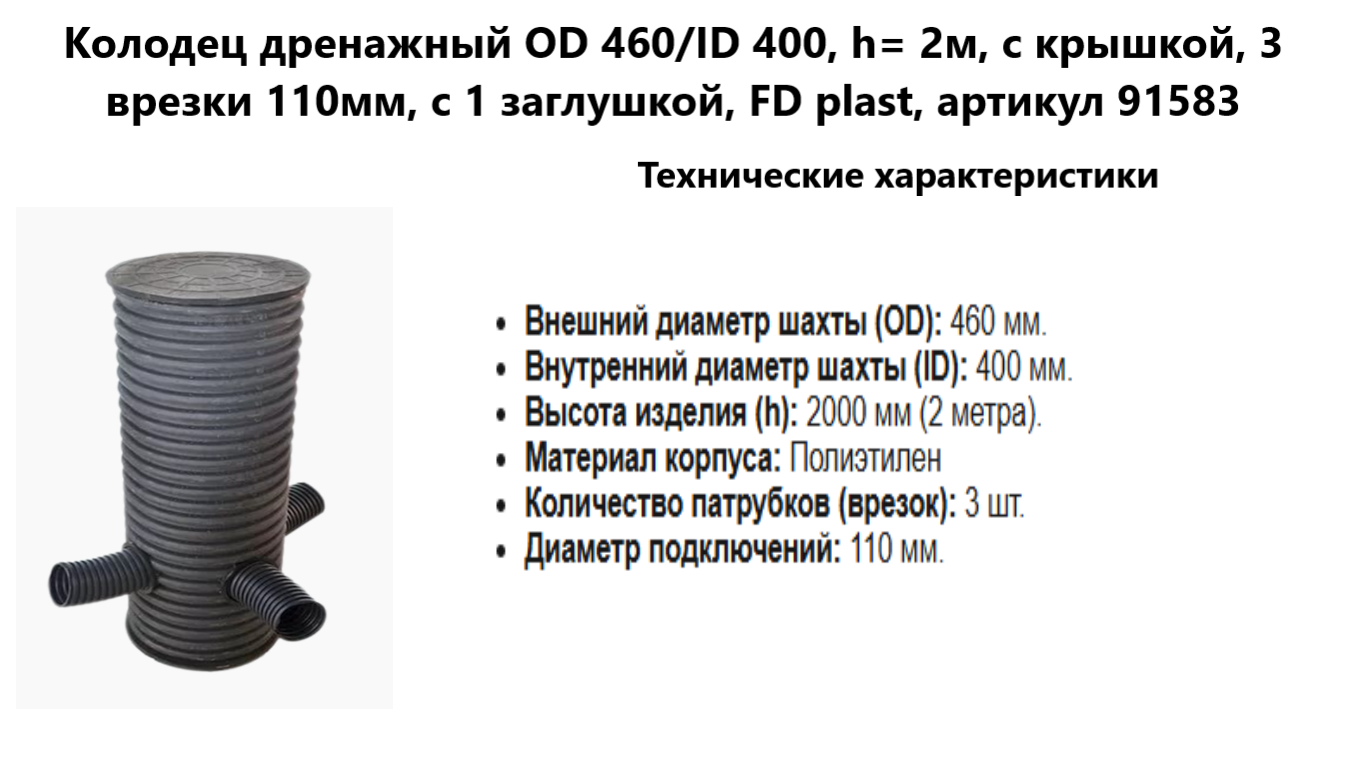 Колодец дренажный OD 460/ID 400, h= 2м, с крышкой, 3 врезки 110мм, с 1 заглушкой, FD plast, 91583