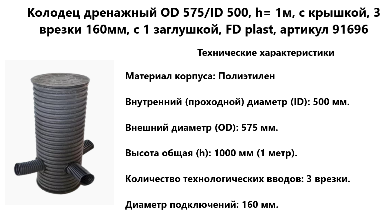 Колодец дренажный OD 575/ID 500, h= 1м, с крышкой, 3 врезки 160мм, с 1 заглушкой, FD plast, 91696