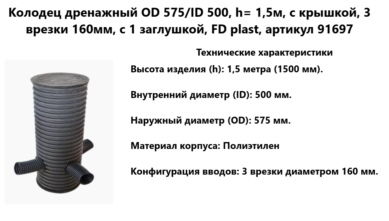 Колодец дренажный OD 575/ID 500, h= 1,5м, с крышкой, 3 врезки 160мм, с 1 заглушкой, FD plast, 91697