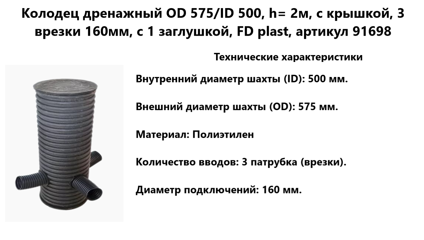 Колодец дренажный OD 575/ID 500, h= 2м, с крышкой, 3 врезки 160мм, с 1 заглушкой, FD plast, 91698